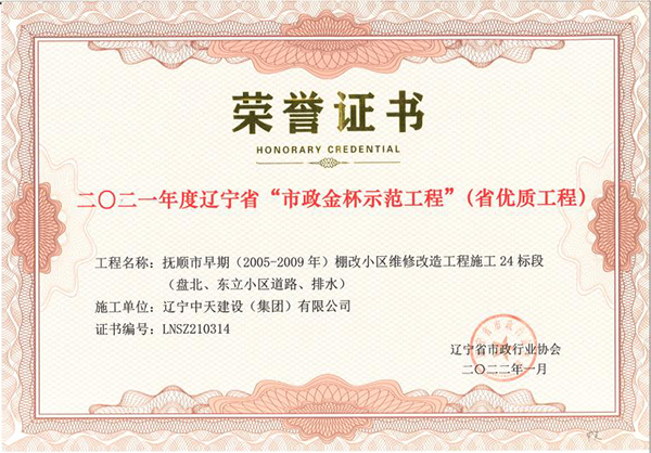 企業(yè)先后榮獲“全國(guó)優(yōu)秀施工企業(yè)”、 “中國(guó)AAA級(jí)信用企業(yè)”、“全國(guó)保障性安居工程建設(shè)勞動(dòng)競(jìng)賽先進(jìn)單位”、“遼寧省最受尊敬企業(yè)”、“遼寧省優(yōu)秀建筑業(yè)企業(yè)”、“遼寧省工程建設(shè)質(zhì)量管理優(yōu)秀企業(yè)”、 “遼寧省守合同、重信用企業(yè)”、遼寧省“AAA級(jí)信用企業(yè)”、 “撫順市安全生產(chǎn)先進(jìn)單位、紅旗單位”、“撫順市安康杯競(jìng)賽先進(jìn)集體”等多項(xiàng)殊榮。